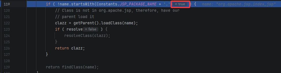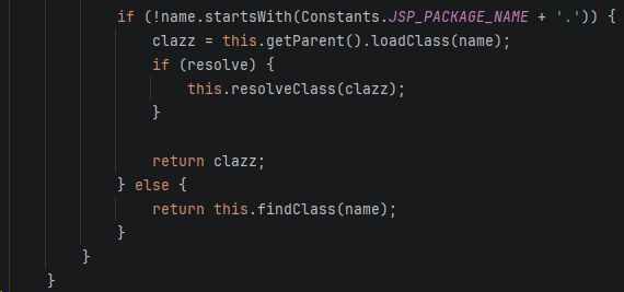会检查类名是否以 org.apache.jsp 开头,如果不是,委托给父类加载器,如果是则调用 URLClassLoader.findClass(name) 进行加载