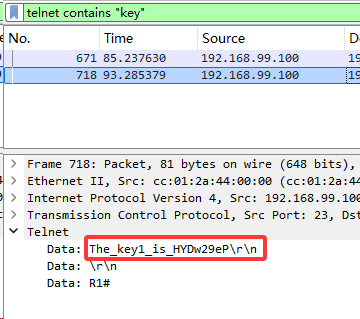 某日接到客户应急需求,客户连接工业控制系统的核心网络设备遭到入侵,初步推测可能是网络设备的远程登录密码被破解,请通过对给出的流量包分析,得到黑客登录网络设备后窃取的机密数据key1。