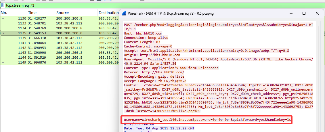 下列抓包⽂件中包含了⽤户登录⽹站过程,请找出⽤户登录⽹站的明⽂密码。格式flag{密码}