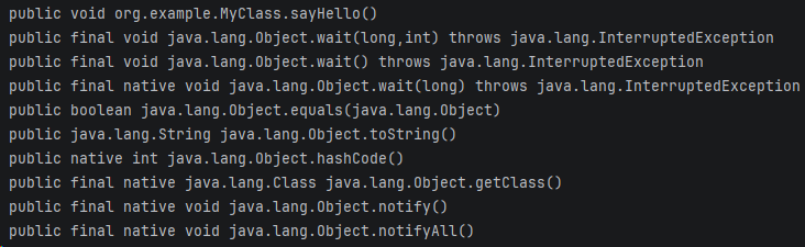 1 2 3 4 5 6 7 8 9 10 11 12 13 14 15 16 17 18 19 20 21 22 23 package org.example; import java.lang.reflect.Method; class MyClass { public void sayHello () { System.out.println("Hello, World!" ); } } public class Main { public static void main (String[] args) throws Exception{ String className = "org.example.MyClass" ; Class class1 = Class.forName(className); Method[] methods = class1.getMethods(); for (int i = 0 ; i < methods.length; i++) { System.out.println(methods[i]); } } }