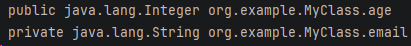 1 2 3 4 5 6 7 8 9 10 11 12 13 14 15 16 17 18 19 20 21 22 23 24 25 26 package org.example; import java.lang.reflect.Field; class MyClass { public Integer age; private String email; public void sayHello () { System.out.println("Hello, World!" ); } } public class Main { public static void main (String[] args) throws Exception{ String className = "org.example.MyClass" ; Class class1 = Class.forName(className); Field[] fields = class1.getDeclaredFields(); for (int i = 0 ; i < fields.length; i++) { System.out.println(fields[i]); } } }