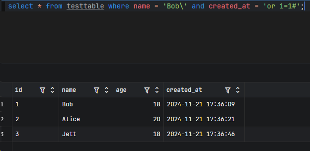 select * from users where username='admin\' and password='or 1=1#';