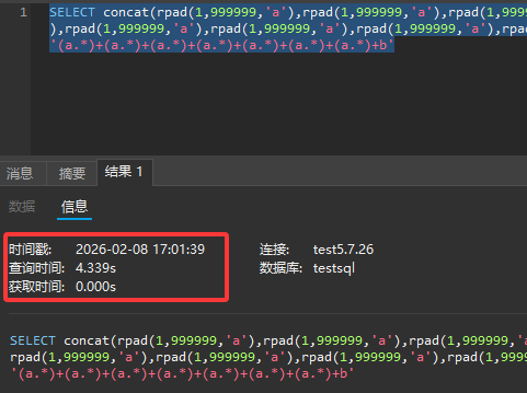 在字符 1 右边补 a,直到长度为 999999,如果 RLIKE 匹配成功,查询可能会因为字符串的匹配而快速返回结果,而不成功则可能会因为数据库需要更多时间来处理这个复杂的匹配而产生延时