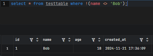 select * from testtable where !(name <> 'Bob');